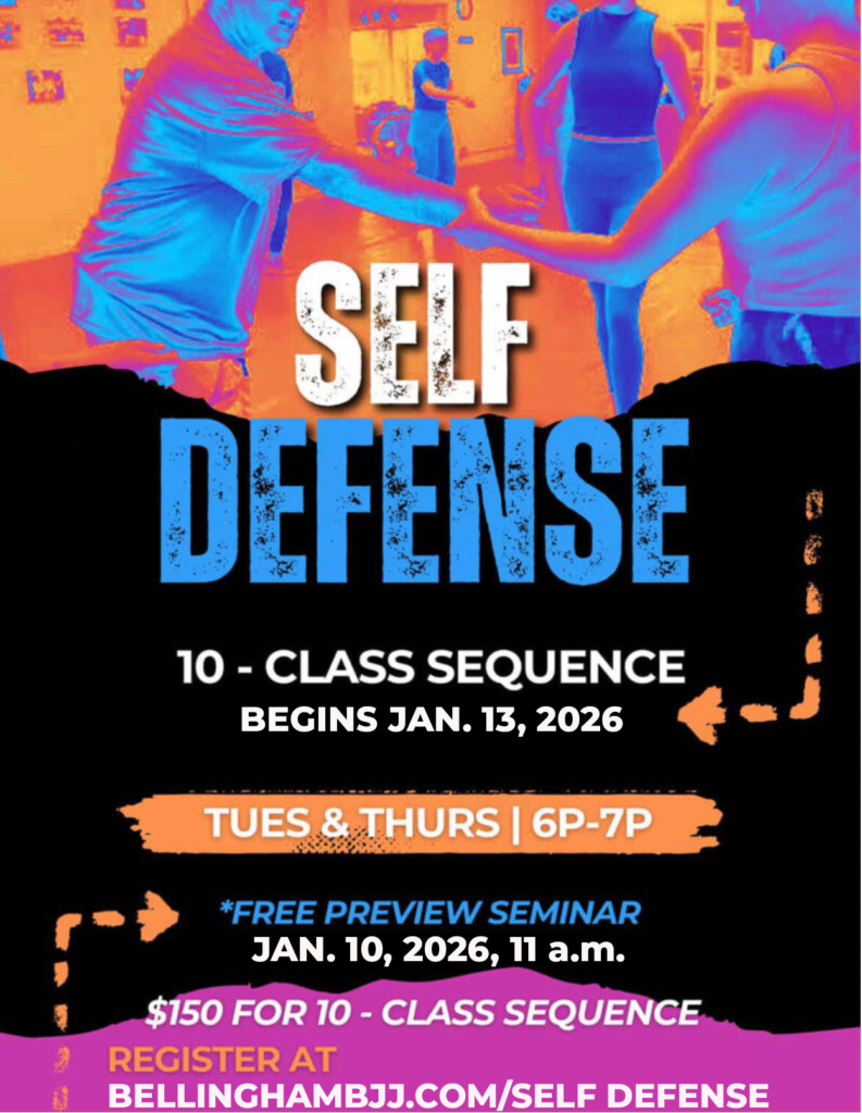 Existing monthly members of Bellingham BJJ get this class included in their membership, so if you’re a member, you don’t need to sign up for this — just show up. Full membership in the academy covers ALL of our ~35 classes per week. Current Intro to BJJ students: after completing that class, you’re welcome to attend all of these classes, including self defense.